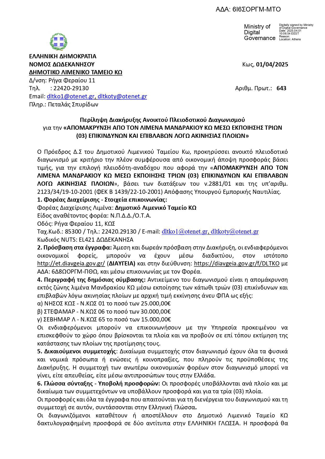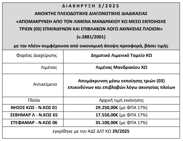 Ο Πρόεδρος Δ.Σ του Δημοτικού Λιμενικού Ταμείου ΚΩ προκηρύσσει Ανοικτό Πλειοδοτικό Διαγωνισμό για την «ΑΠΟΜΑΚΡΥΝΣΗ ΑΠΟ ΤΟΝ ΛΙΜΕΝΑ ΜΑΝΔΡΑΚΙΟΥ ΚΩ ΜΕΣΩ ΕΚΠΟΙΗΣΗΣ ΤΡΙΩΝ (03) ΕΠΙΚΙΝΔΥΝΩΝ ΚΑΙ ΕΠΙΒΛΑΒΩΝ ΛΟΓΩ ΑΚΙΝΗΣΙΑΣ ΠΛΟΙΩΝ» που θα διεξαχθεί σύμφωνα με τις διατάξεις της υπ’αριθμ.2123/34/19-10-2001 (ΦΕΚ 1439/22-10-2001, Τεύχος Δεύτερο) Απόφασης Υπουργού Εμπορικής Ναυτιλίας και την παρούσα Διακήρυξη, και καλεί κάθε ενδιαφερόμενο να υποβάλει προσφορά κατά τις ειδικότερες διατάξεις της παρούσης και την ισχύουσα νομοθεσία.